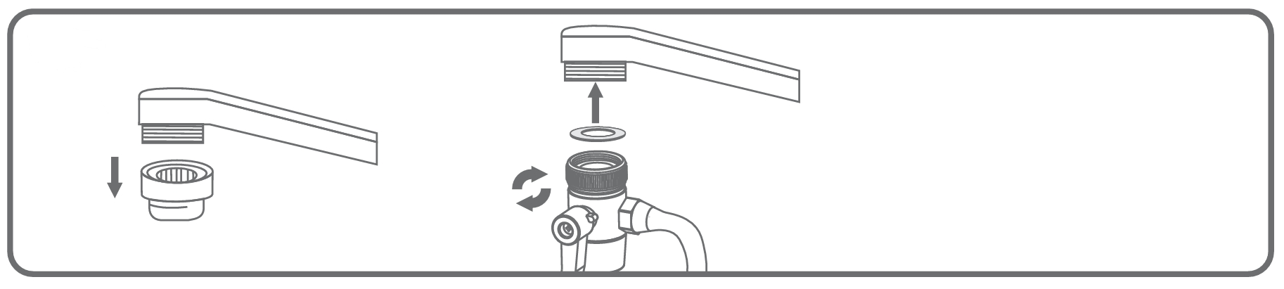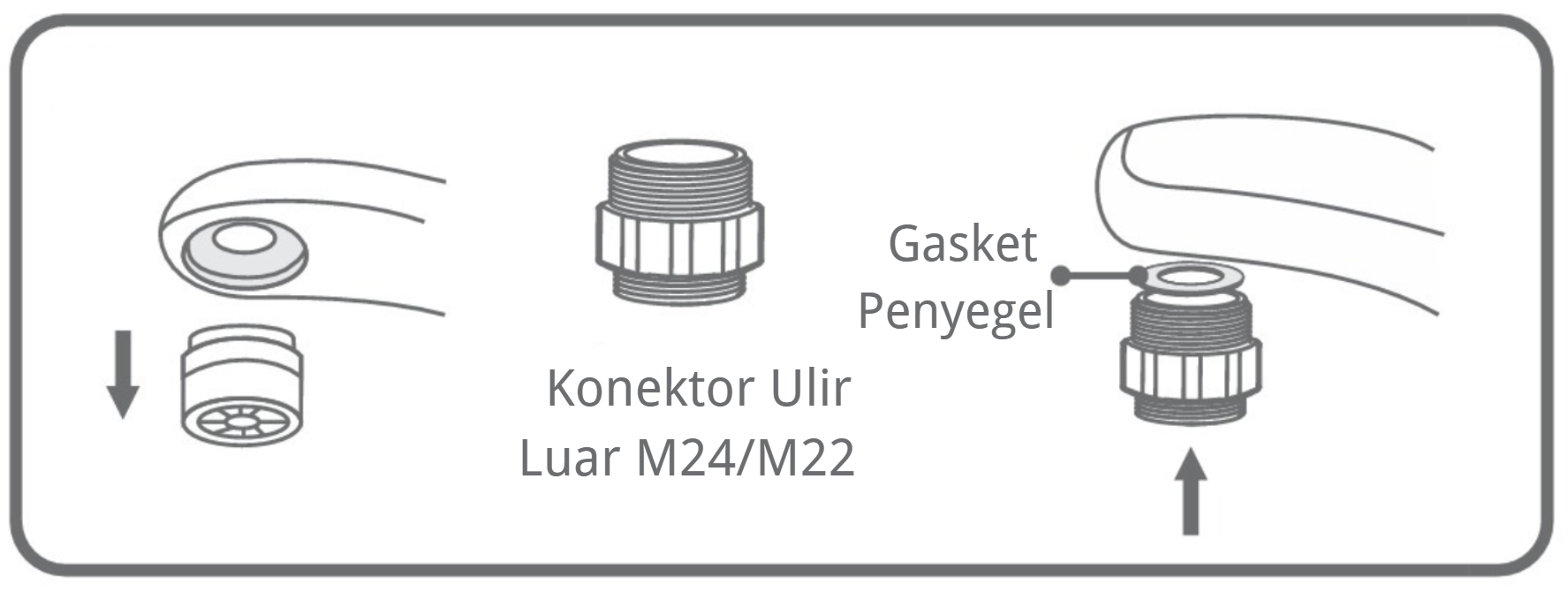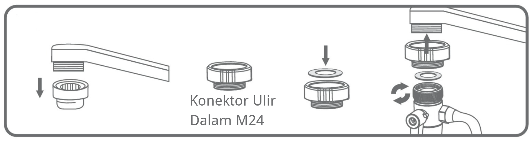 ② Untuk keran M24: Lepas aerator keran, pasang gasket ke konektor ulir dalam M24. Pasang konektor tersebut (pastikan gasket terpasang dengan benar) ke keran dan kencangkan murnya.