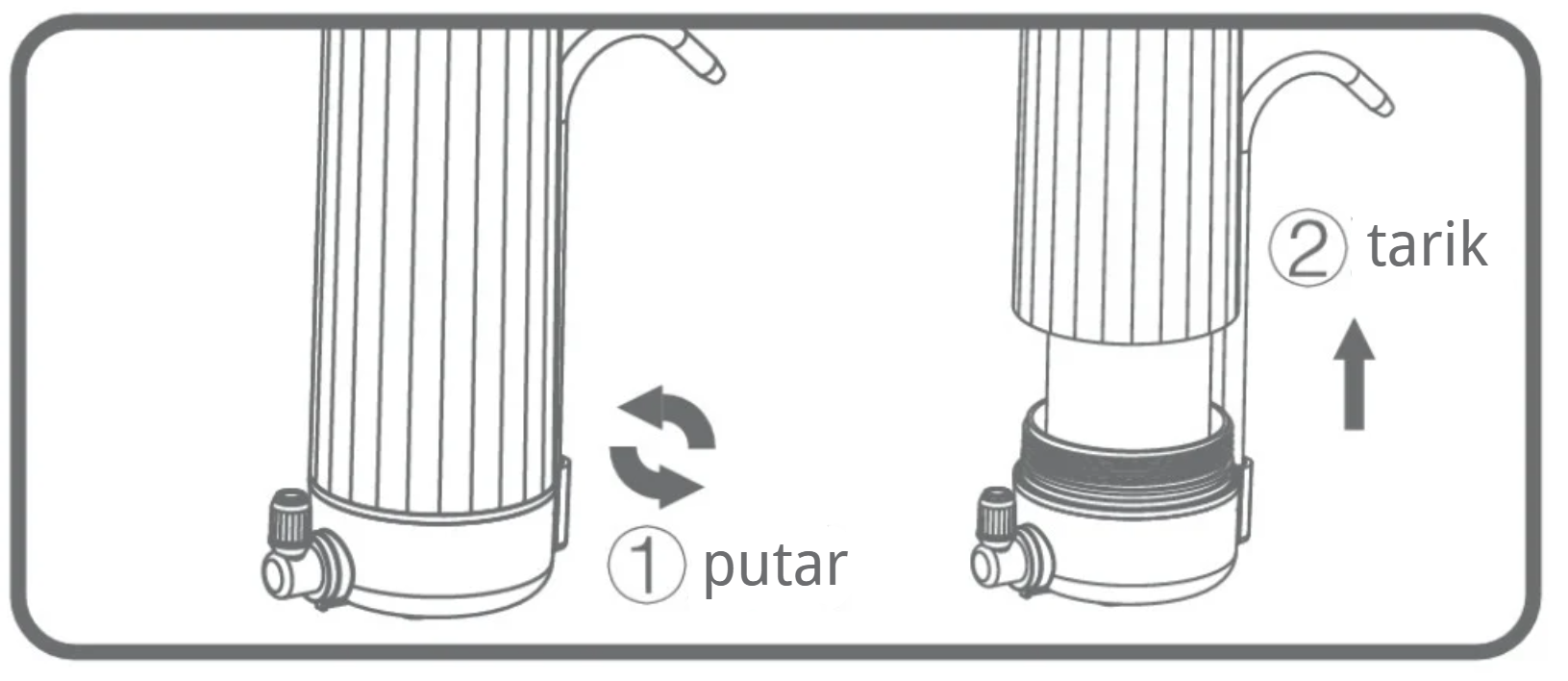 (2) Masa pakai bergantung pada standar kualitas air di beberapa wilayah. Jika kualitas air aktual atau frekuensi penggunaan berbeda jauh dari standar umum, masa pakai actual dapat berbeda dan masalah seperti penyumbatan atau fungsi yang tidak efektif kemungkinan terjadi. Dalam kasus tersebut, kondisi filter yang sebenarnya harus digunakan sebagai acuan penggantian, dan segera hubungi Customer Service kami.