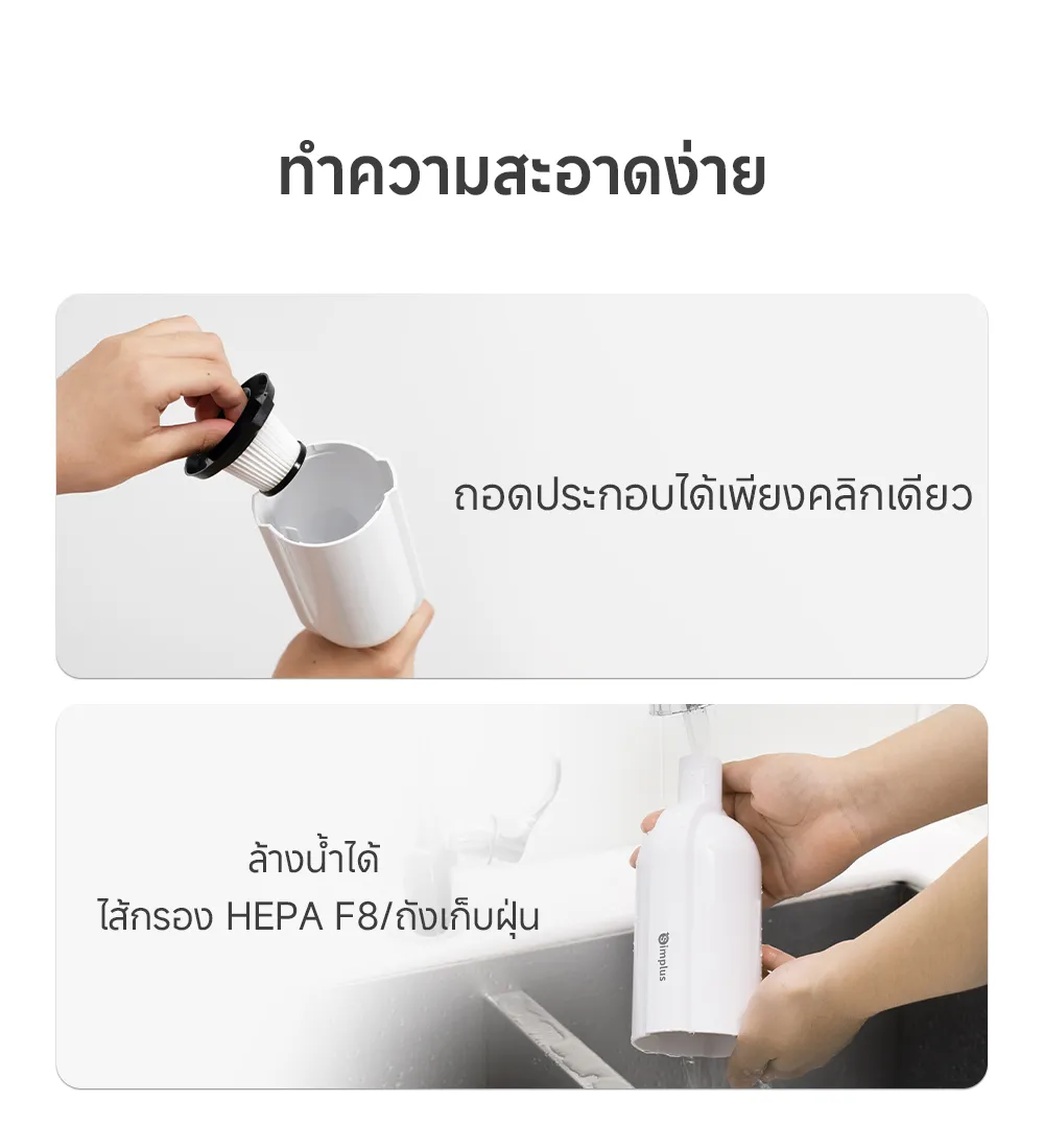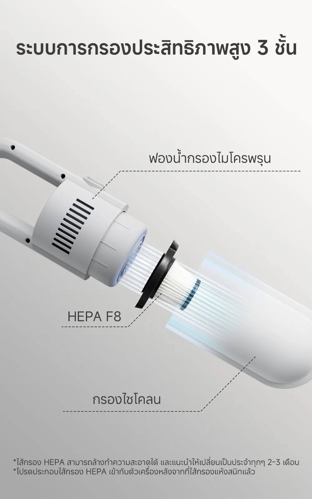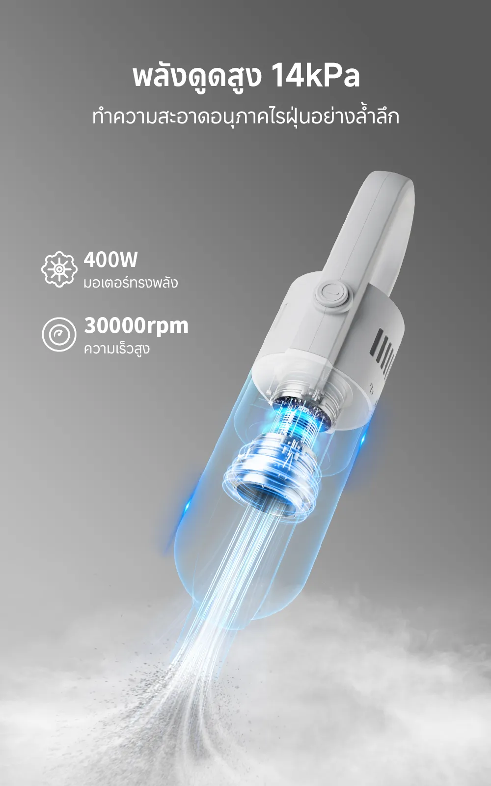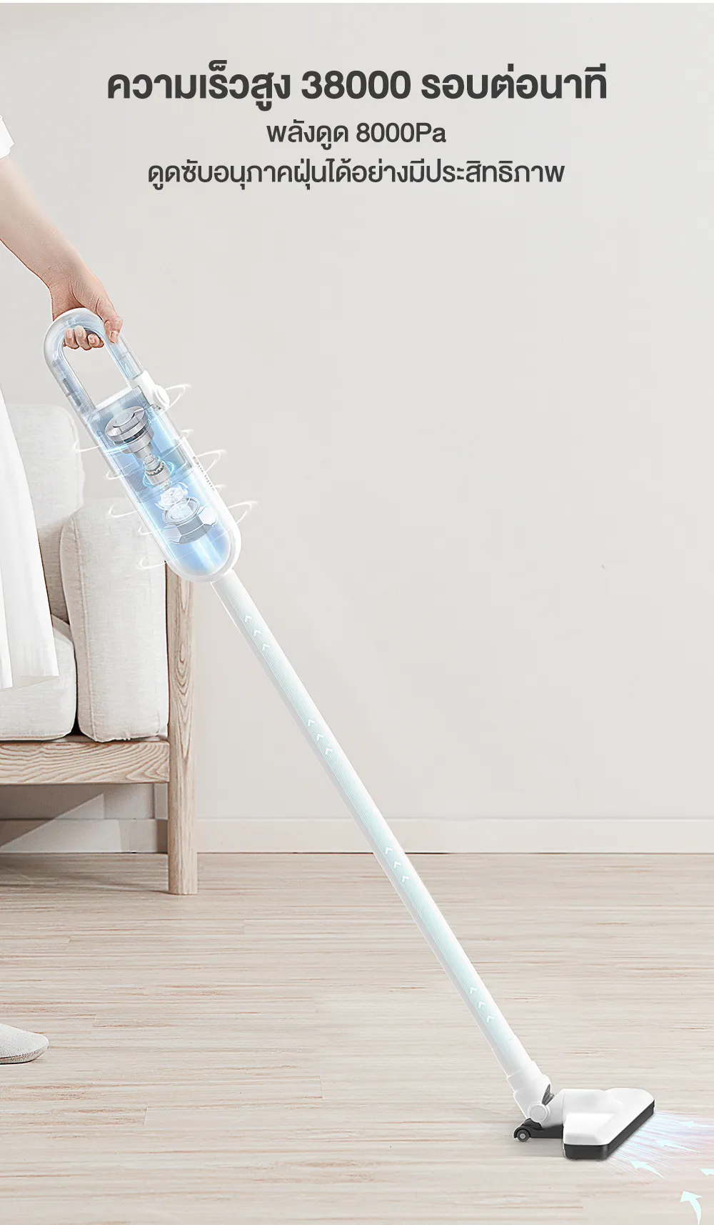 1. พลังดูด 8000pa (วัดจริง) , มอเตอร์ไร้แปรงถ่าน 38000rpm การเก็บฝุ่นที่มีประสิทธิภาพ;